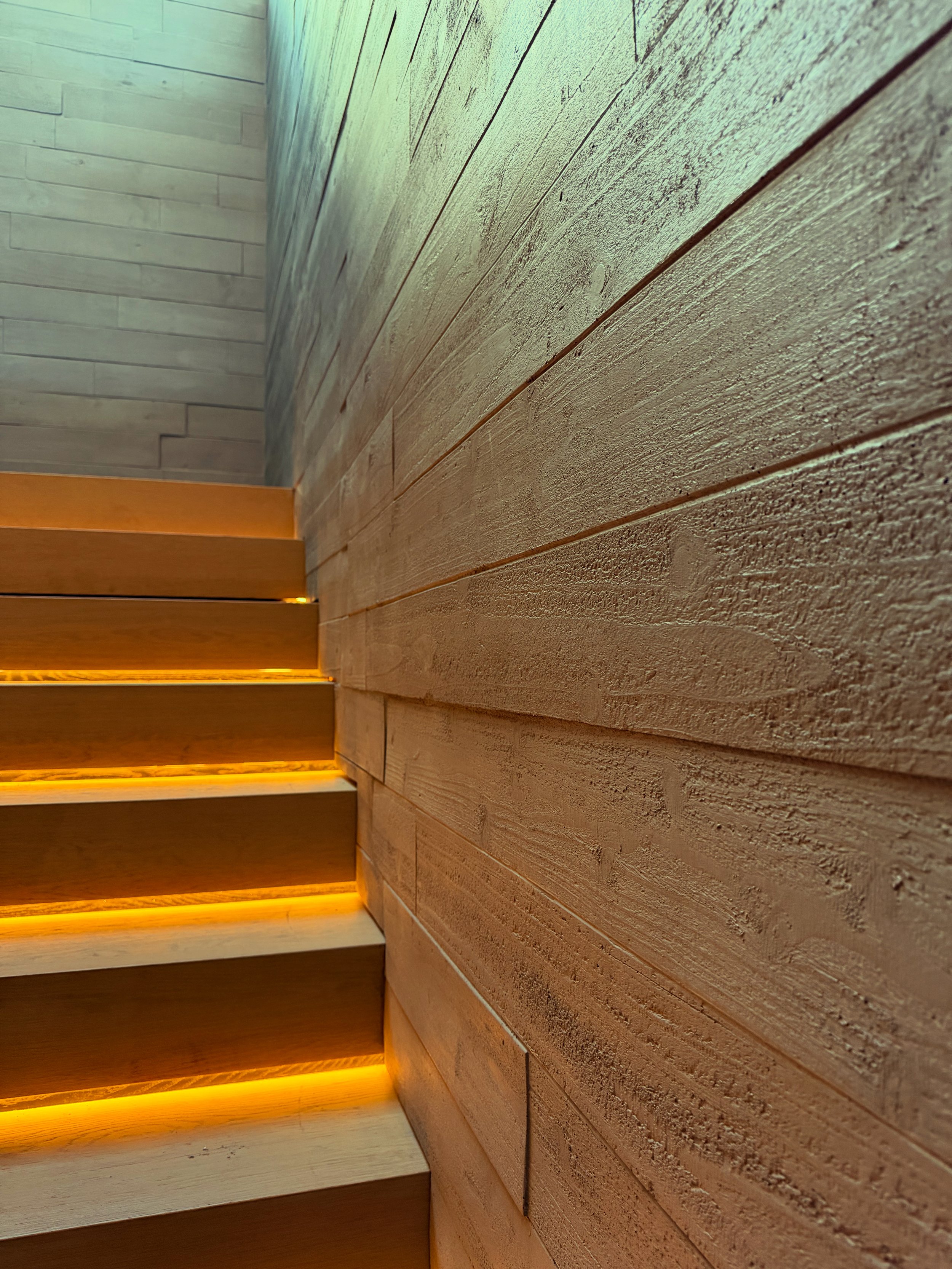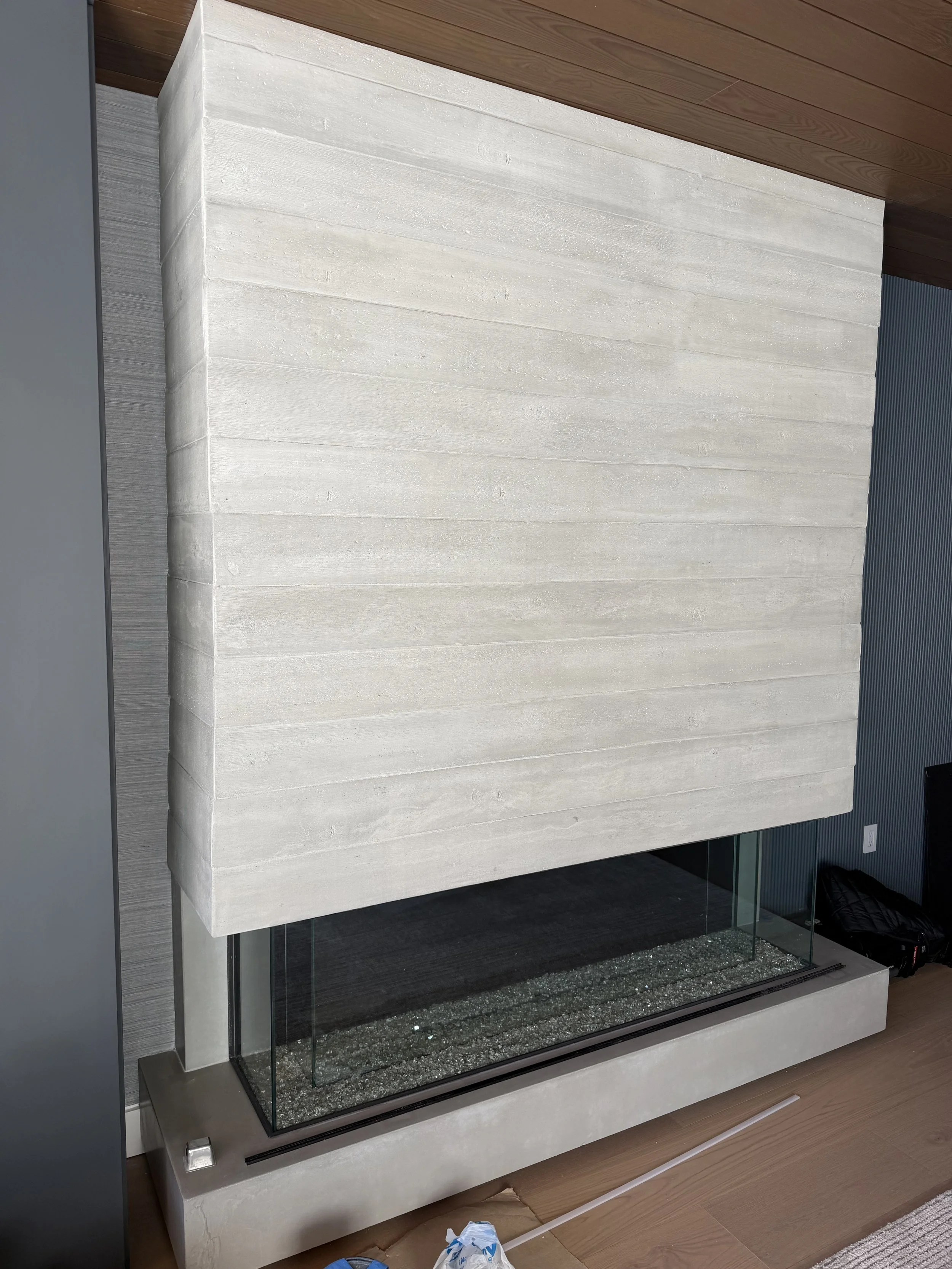 Unlike the wall cladding, which was done in large panels, this one-of-a-kind fireplace was clad using single “shiplap” style concrete boards. at eight feet long each, and six inches wide, these boards can be used for cladding both in interior and exterior applications.