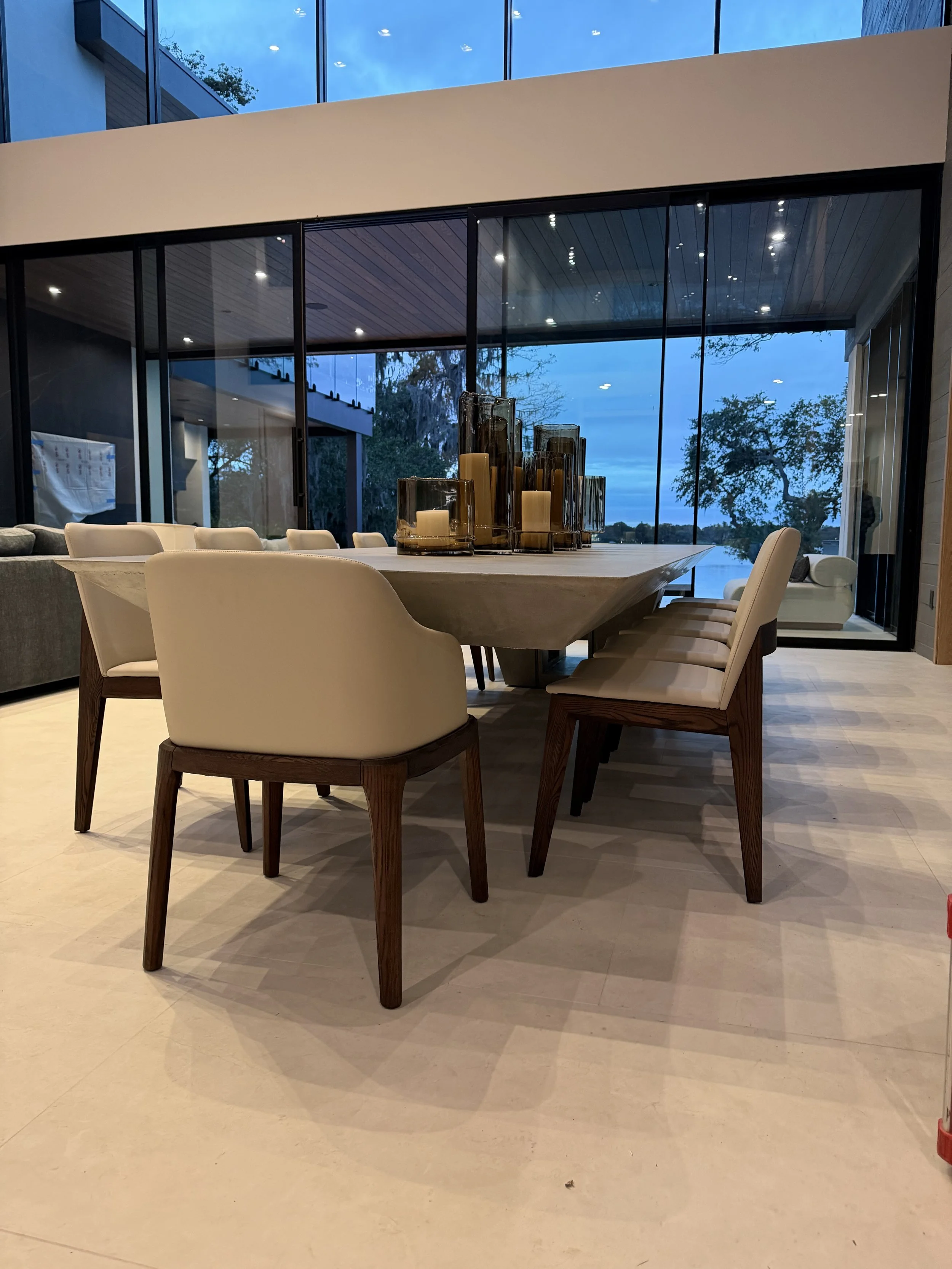 Designed by Lead Artisan Caleb Lawson in late 2018, this gravity defying feat of design and engineering was conceived with one goal in mind: Make people ask “How!?”. With a 12 foot cantilever, this table is supported entirely by the base at one end, bolted through the structural beams below; it stands as a permanent focal point to this stunning space.
